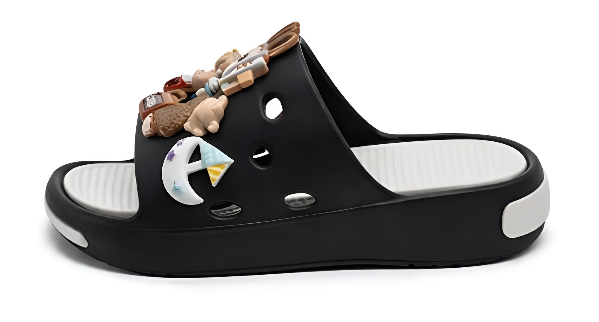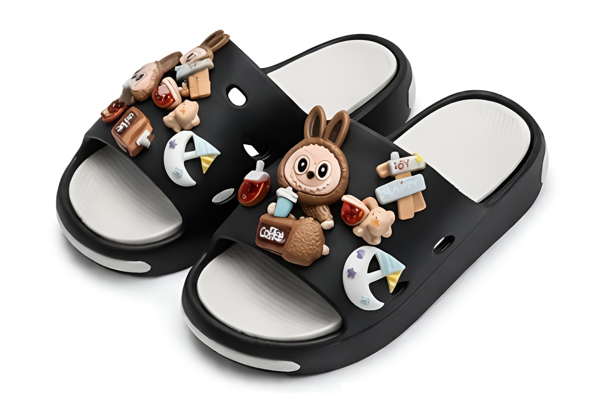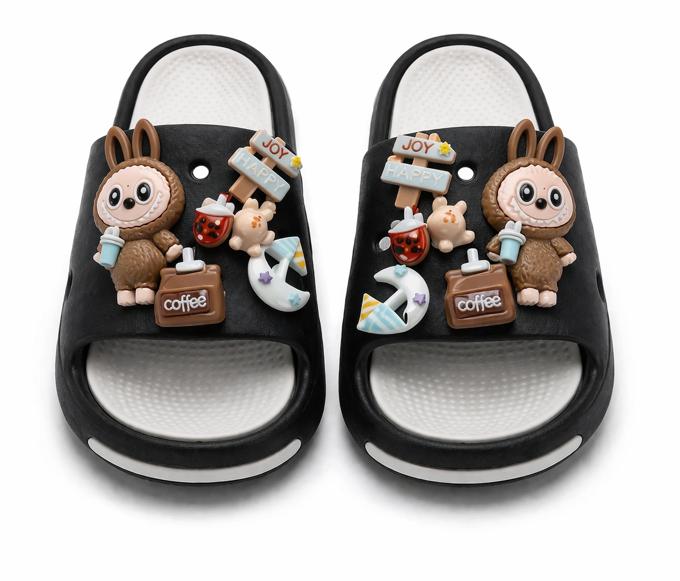 Nowoczesne klapki dziecięce w klasycznym czarnym kolorze z modnym motywem LABUBU to idealne połączenie stylu i wygody. Model wyróżnia się efektownymi ozdobami 3D inspirowanymi popularnym designem LABUBU – uroczą postacią oraz dodatkowymi elementami dekoracyjnymi (kubek „coffee”, napisy „JOY”, „HAPPY”).