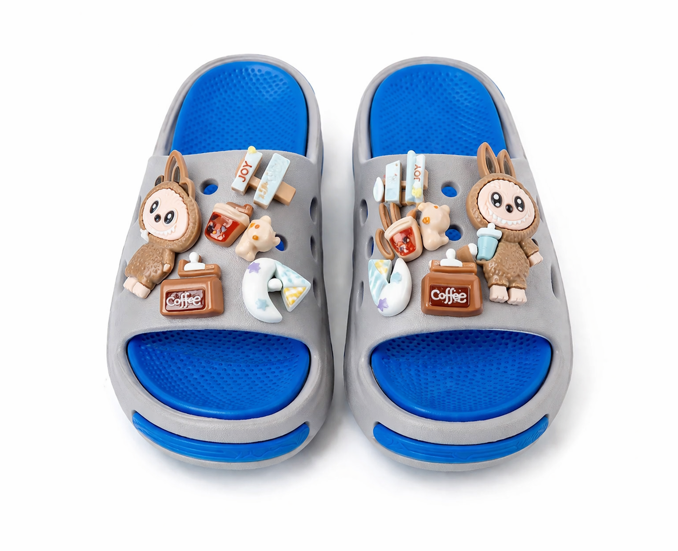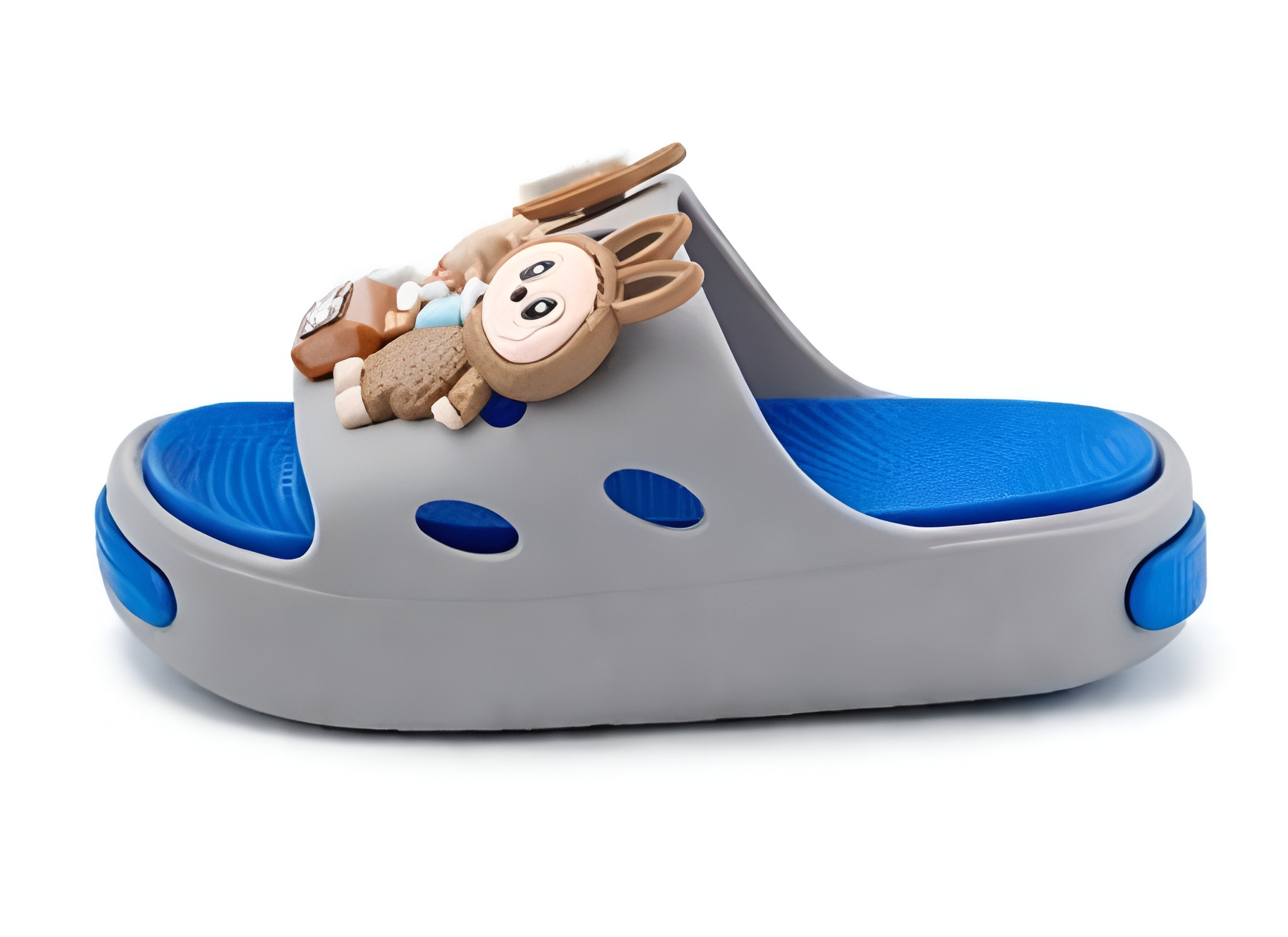 Klapki dziecięce z motywem LABUBU w nowoczesnym połączeniu kolorów szarego i niebieskiego to doskonały wybór dla dzieci ceniących wygodę i oryginalny wygląd. Urocze ozdoby 3D z postaciami i elementami dekoracyjnymi nadają obuwiu wyjątkowego charakteru, a ergonomiczna konstrukcja zapewnia komfort noszenia przez cały dzień.