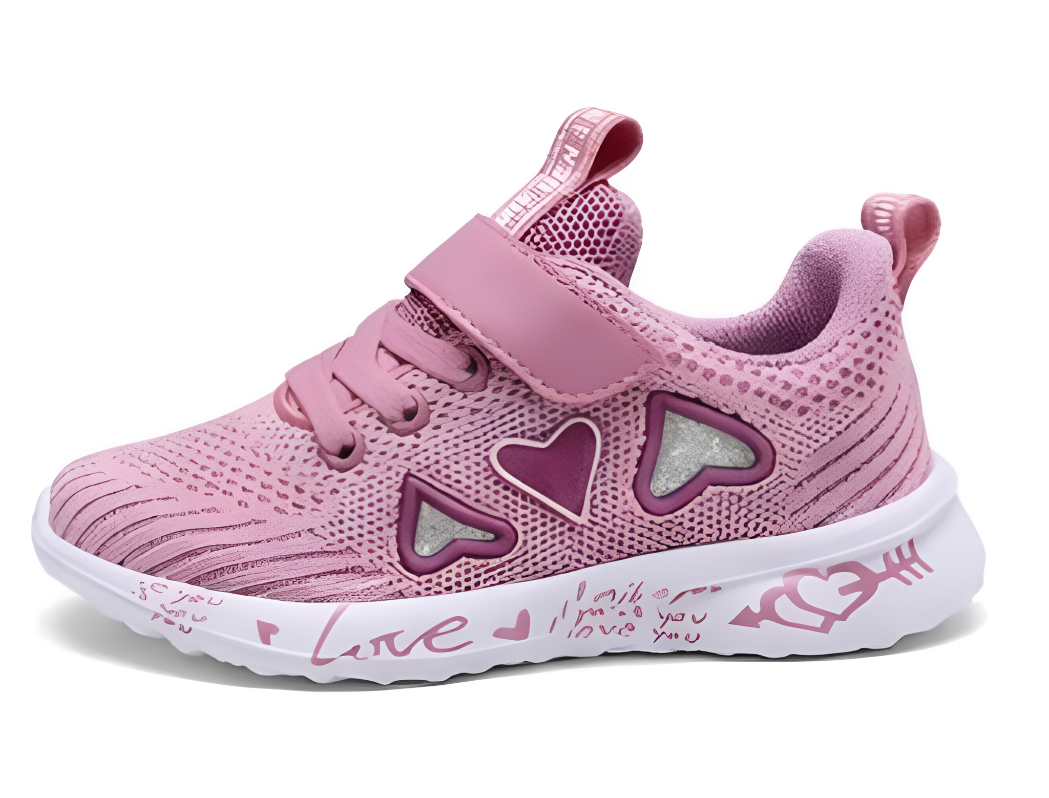 Lekkie i wygodne buty sportowe dla dziewczynki w subtelnym, różowym odcieniu. Model wyróżnia się minimalistycznym designem z ozdobnymi aplikacjami w kształcie serduszek oraz delikatnymi nadrukami na podeszwie. Jednolita kolorystyka sprawia, że buty łatwo dopasować do codziennych stylizacji.