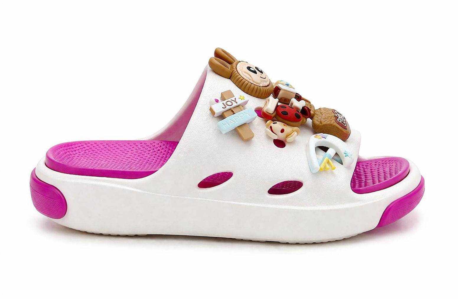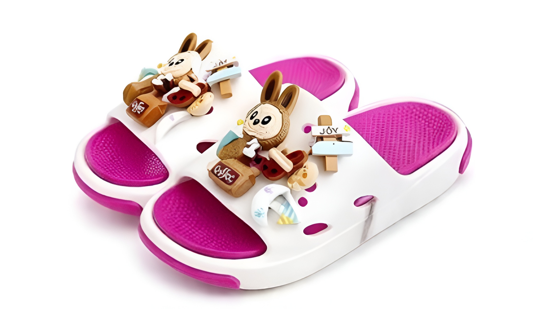Cholewka została ozdobiona zabawnymi elementami 3D (Labubu i akcesoria), które nadają klapkom wyjątkowy, dziecięcy charakter. Dzięki lekkiej konstrukcji i odpowiedniemu profilowaniu stopy, obuwie zapewnia wygodę podczas codziennego użytkowania.