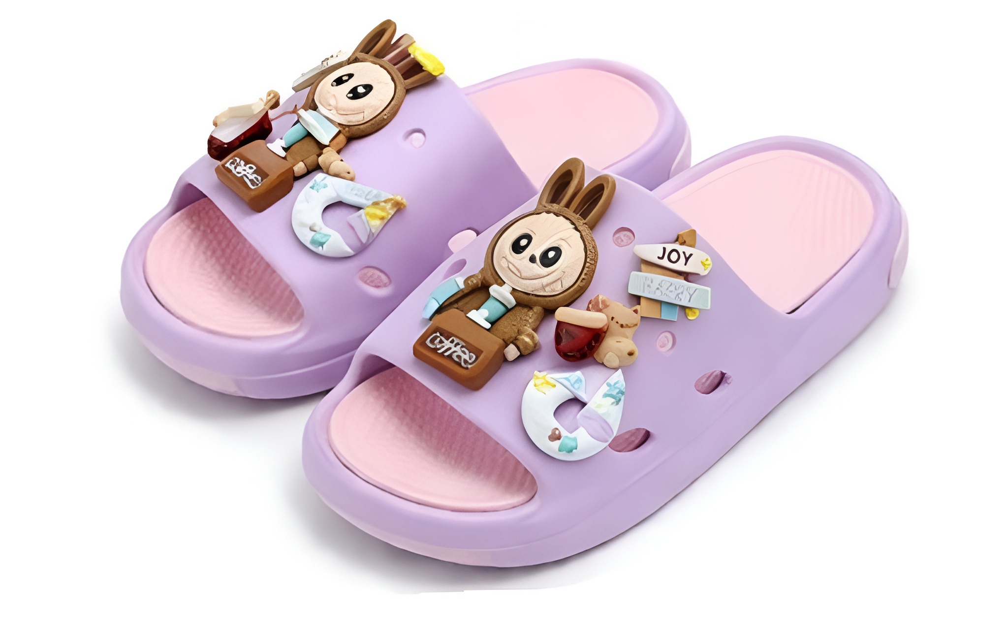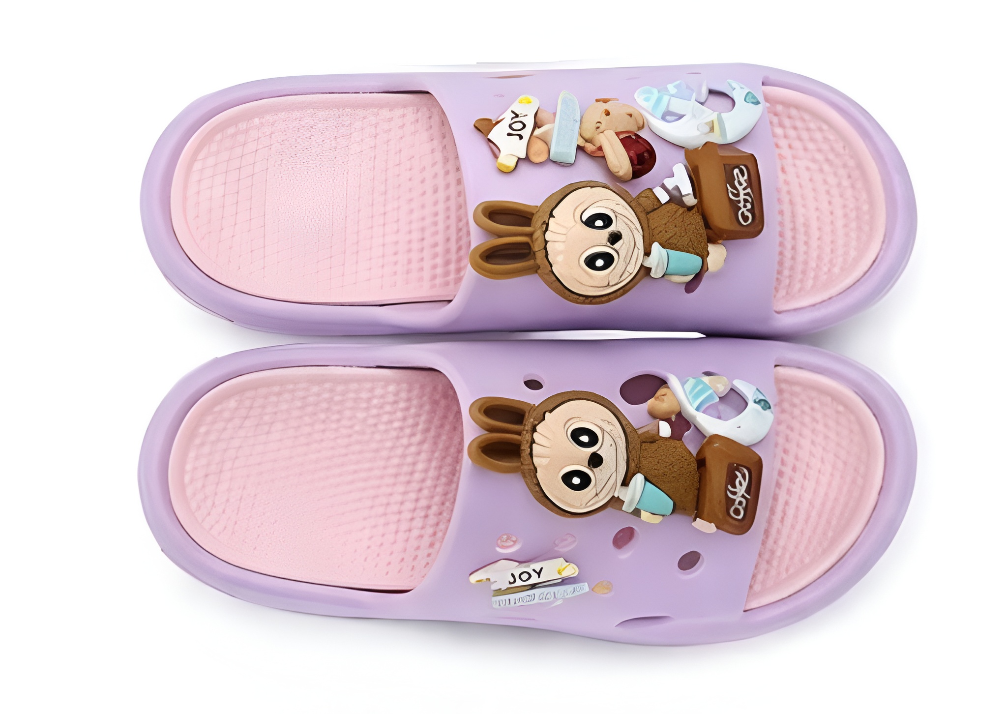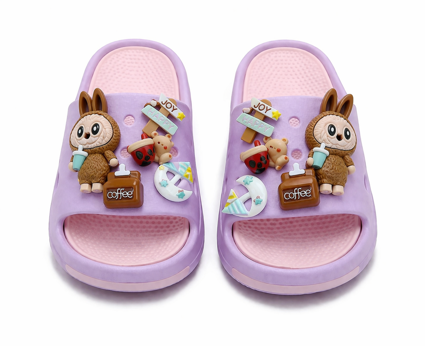 Cholewka ozdobiona jest kolorowymi elementami 3D (m.in. Labubu, kubek, napisy), które przyciągają uwagę i nadają obuwiu wyjątkowy, zabawny charakter. Klapki są łatwe do założenia i sprawdzą się zarówno w domu, jak i na zewnątrz.