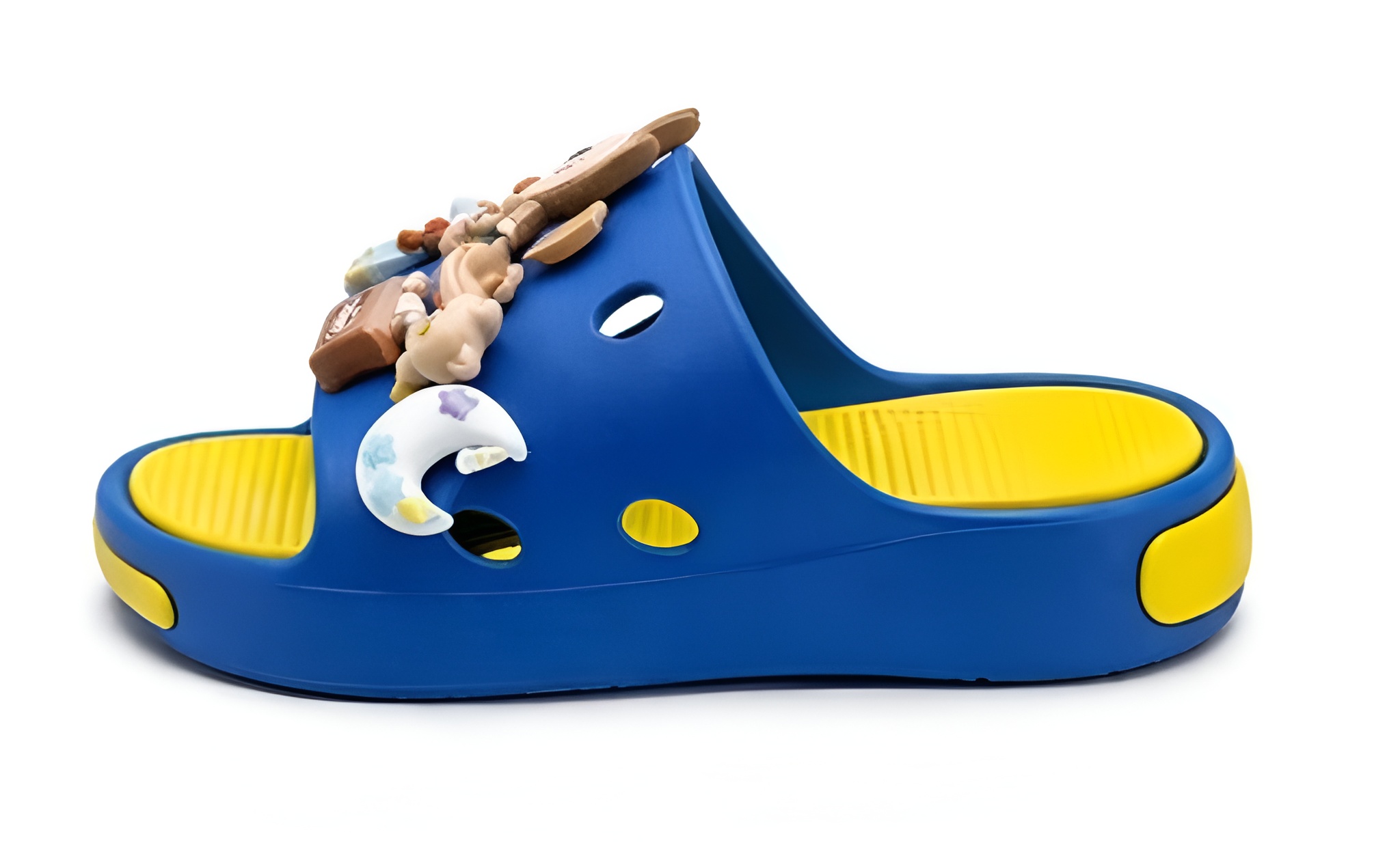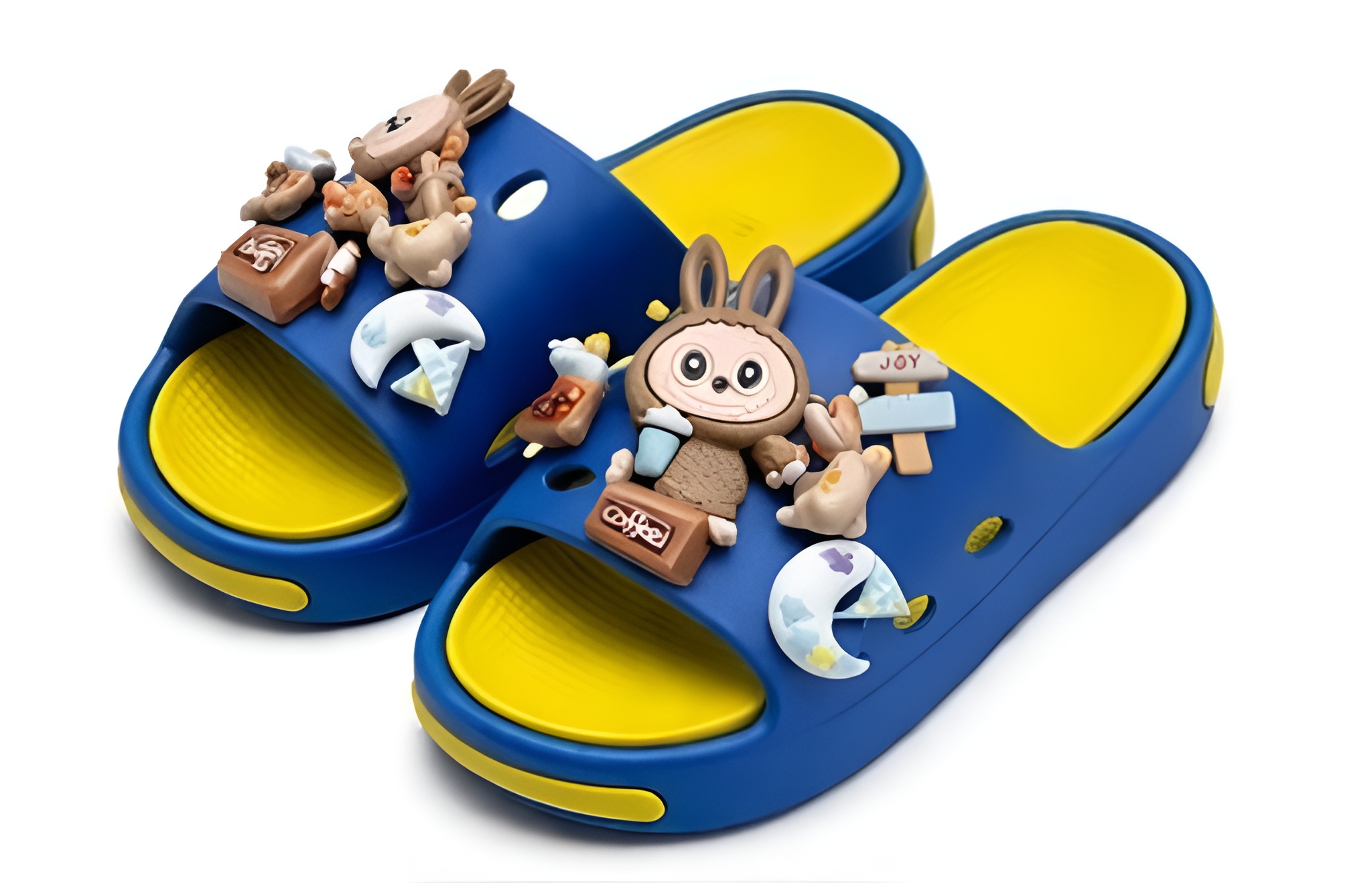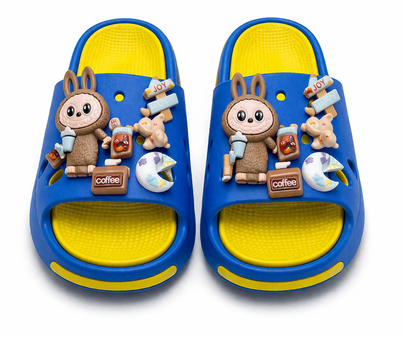 Stylowe klapki dziecięce z motywem LABUBU to idealny wybór dla dzieci, które cenią komfort i kolorowy design. Połączenie intensywnego niebieskiego z energetyczną żółcią oraz zabawne, trójwymiarowe ozdoby sprawiają, że obuwie wyróżnia się na tle innych modeli.
