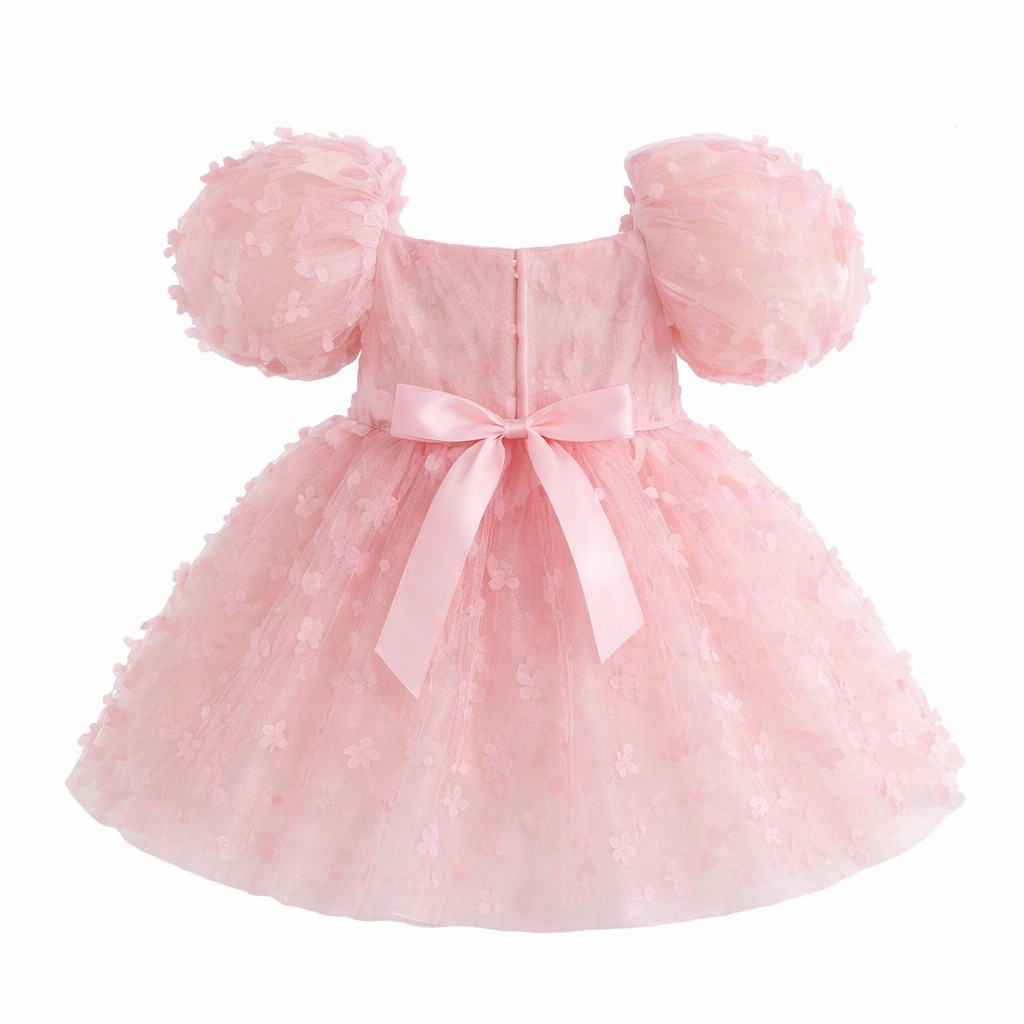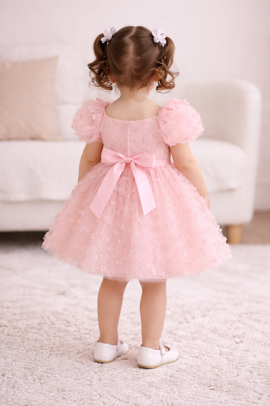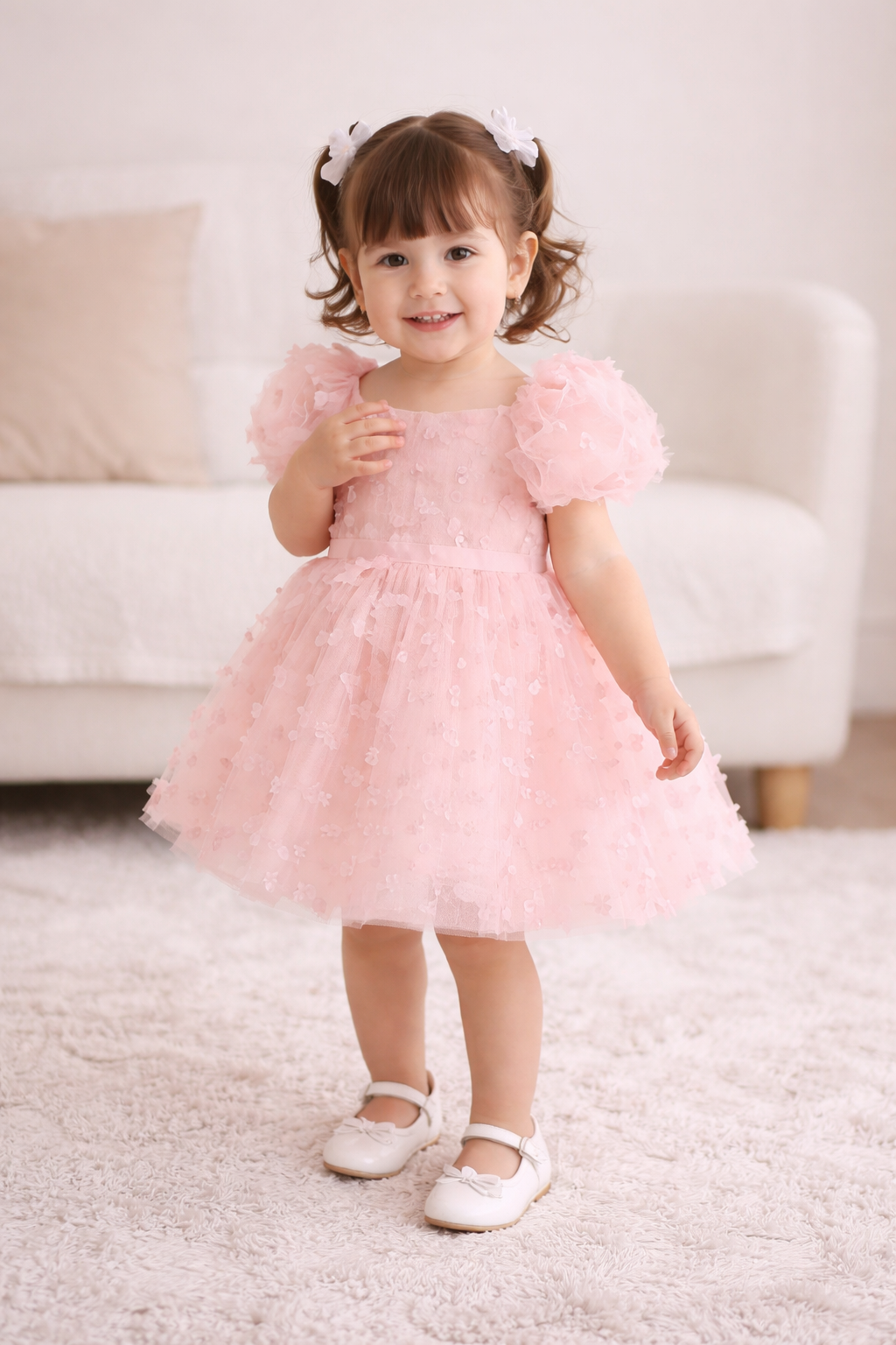 Stylowa i urocza sukienka dziewczęca w odcieniu pastelowego różu, zaprojektowana z myślą o wyjątkowych okazjach. Model wyróżnia się efektowną warstwą tiulu ozdobioną trójwymiarowymi aplikacjami kwiatowymi, które nadają całości subtelnego, bajkowego charakteru. Bufiaste rękawki oraz rozkloszowany dół tworzą elegancką, dziewczęcą sylwetkę.
