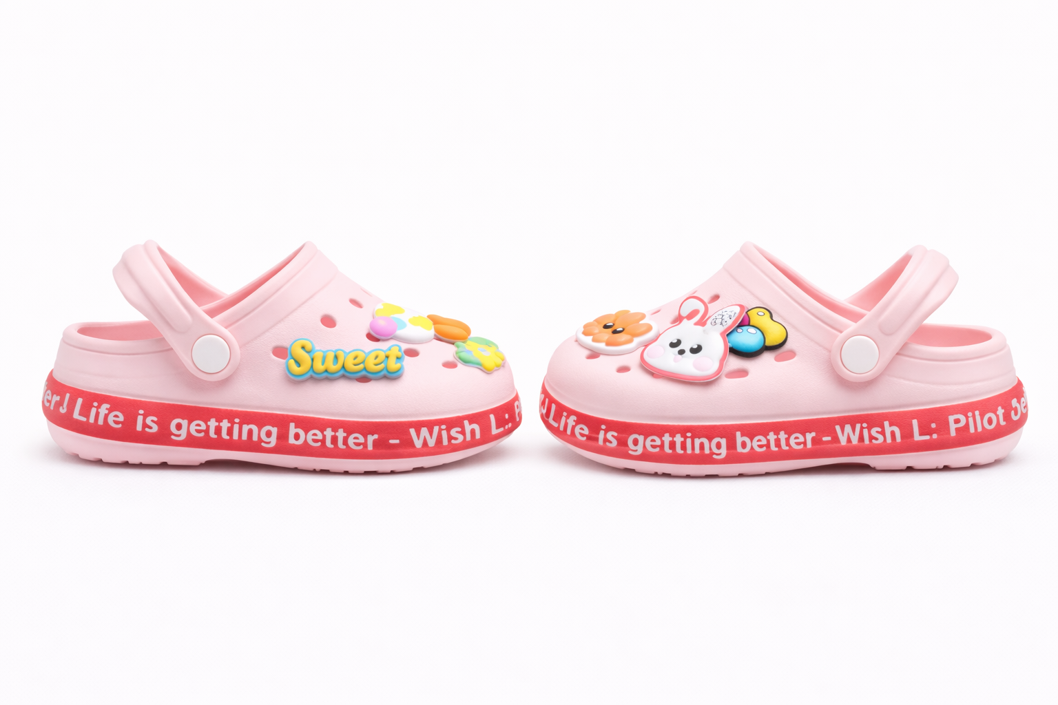 Kolorowe różowe klapki dziecięce ogrodowe to idealne obuwie na lato dla najmłodszych. Wykonane z lekkiej i miękkiej pianki EVA zapewniają komfort noszenia przez cały dzień. Model wyróżnia się uroczym designem z dekoracyjnymi przypinkami, które nadają butom wyjątkowy, dziecięcy charakter.