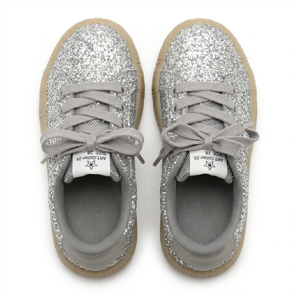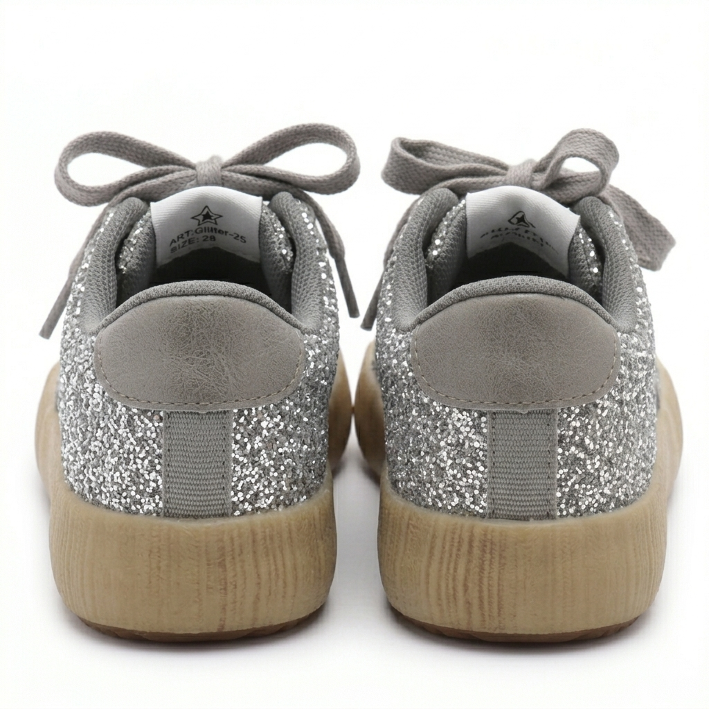 Efektowne srebrne sneakersy dziecięce z brokatowym wykończeniem to idealne połączenie stylu, wygody i funkcjonalności. Błyszcząca powierzchnia przyciąga uwagę, a modny fason z ozdobną gwiazdką sprawia, że buty świetnie uzupełniają codzienne i okazjonalne stylizacje dziecięce.