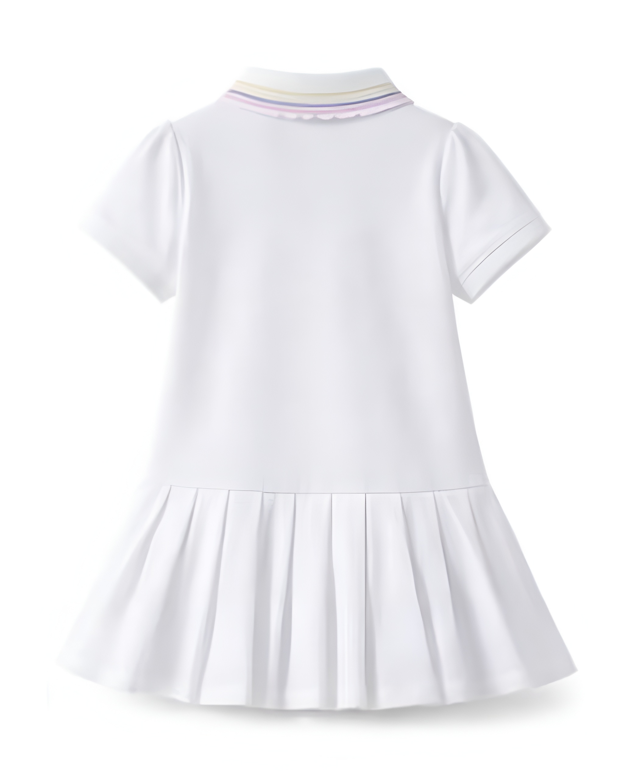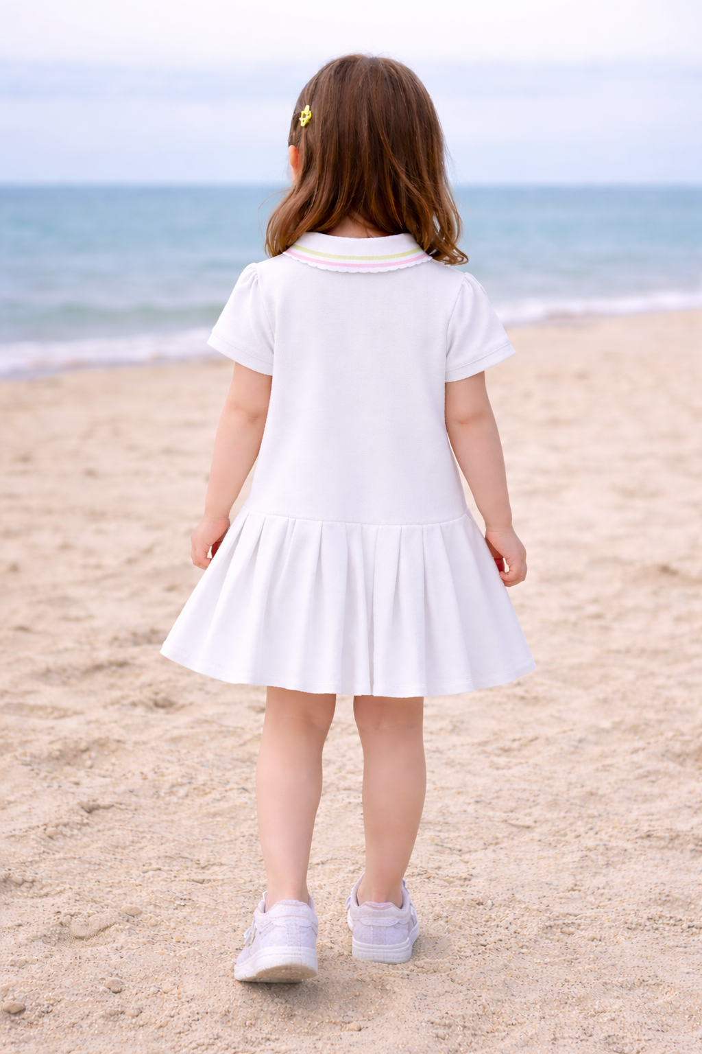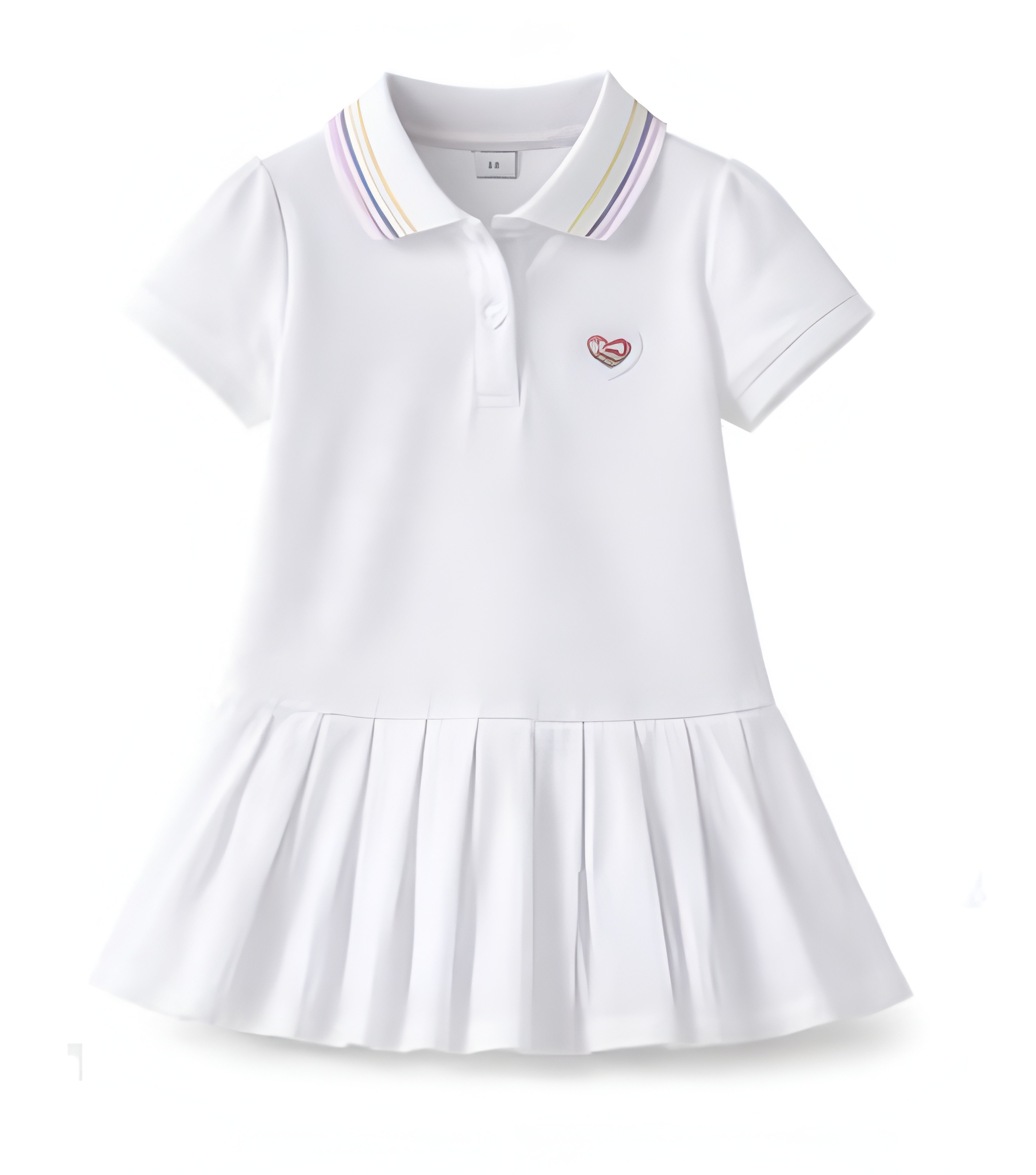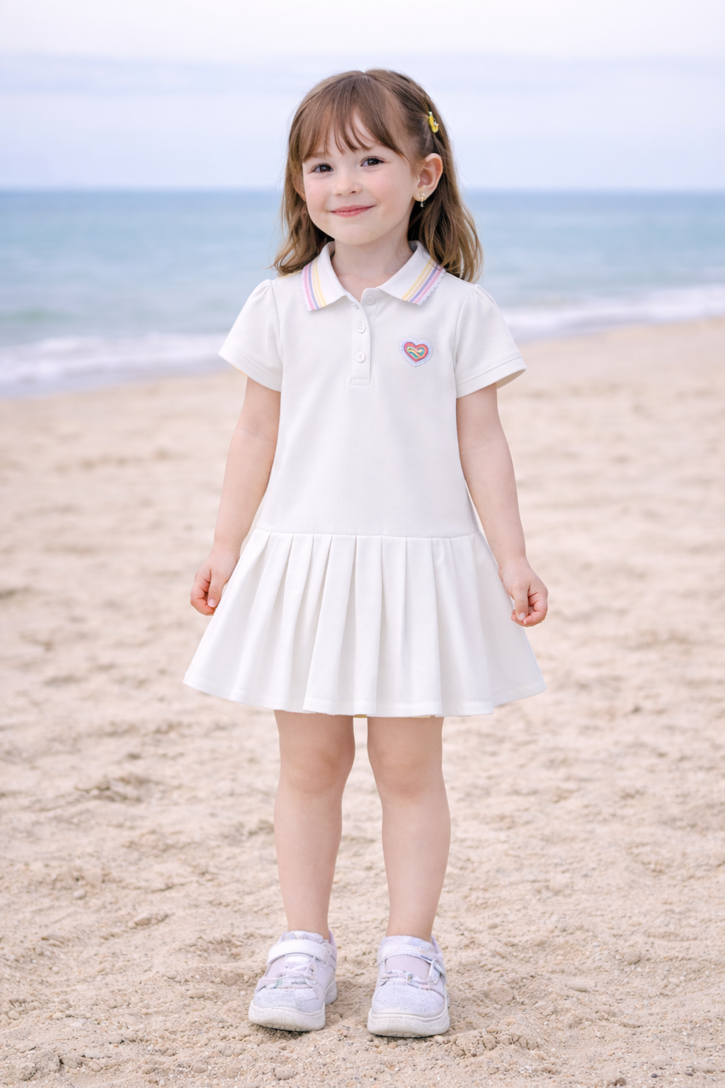 Stylowa biała sukienka dziewczęca z krótkim rękawem to doskonały wybór dla rodziców poszukujących połączenia elegancji, wygody i uniwersalnego designu. Klasyczny fason z plisowanym dołem oraz ozdobnym kołnierzykiem nadaje sukience subtelny, ponadczasowy charakter. Delikatny haft w kształcie serca podkreśla dziewczęcy styl i staranne wykończenie.