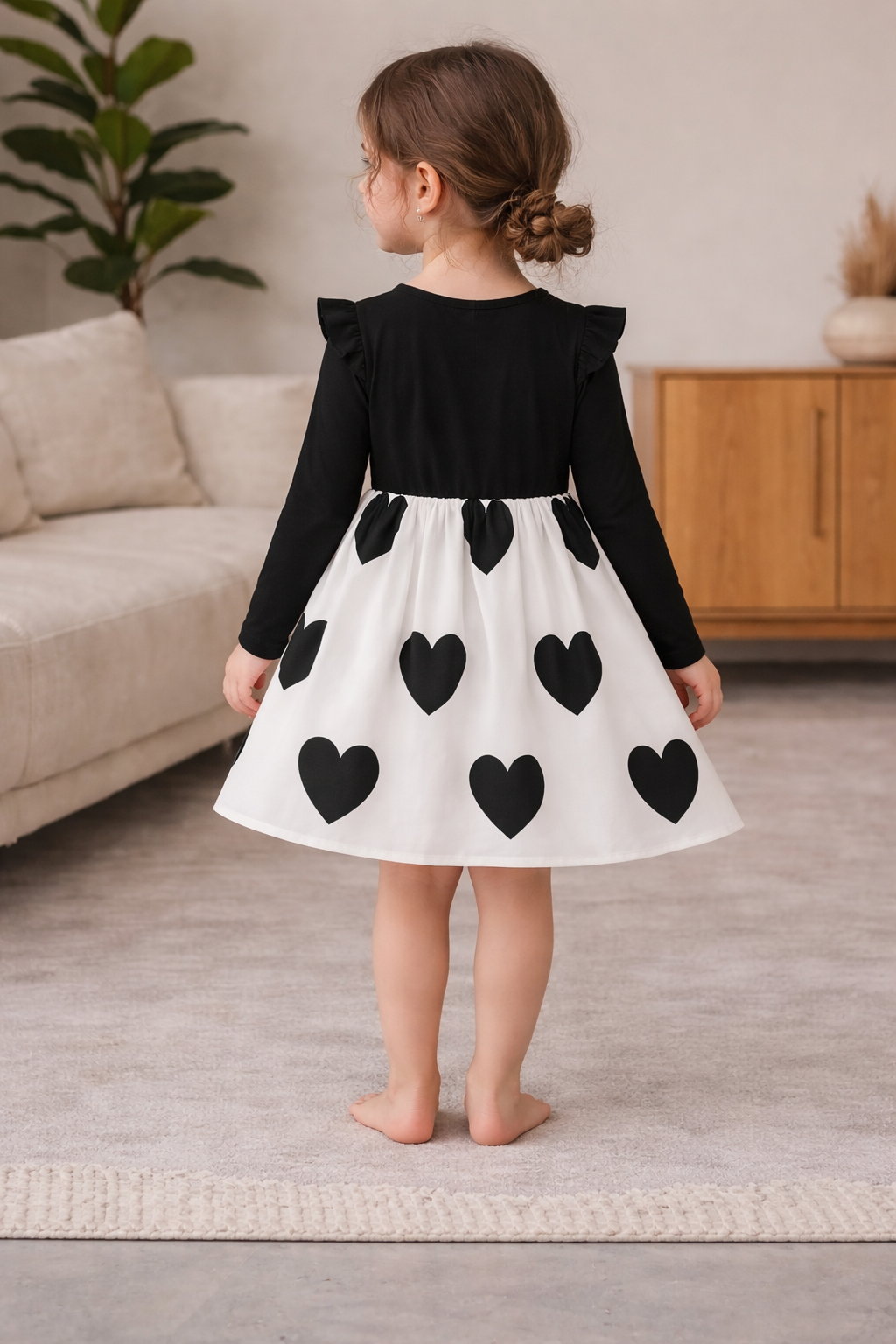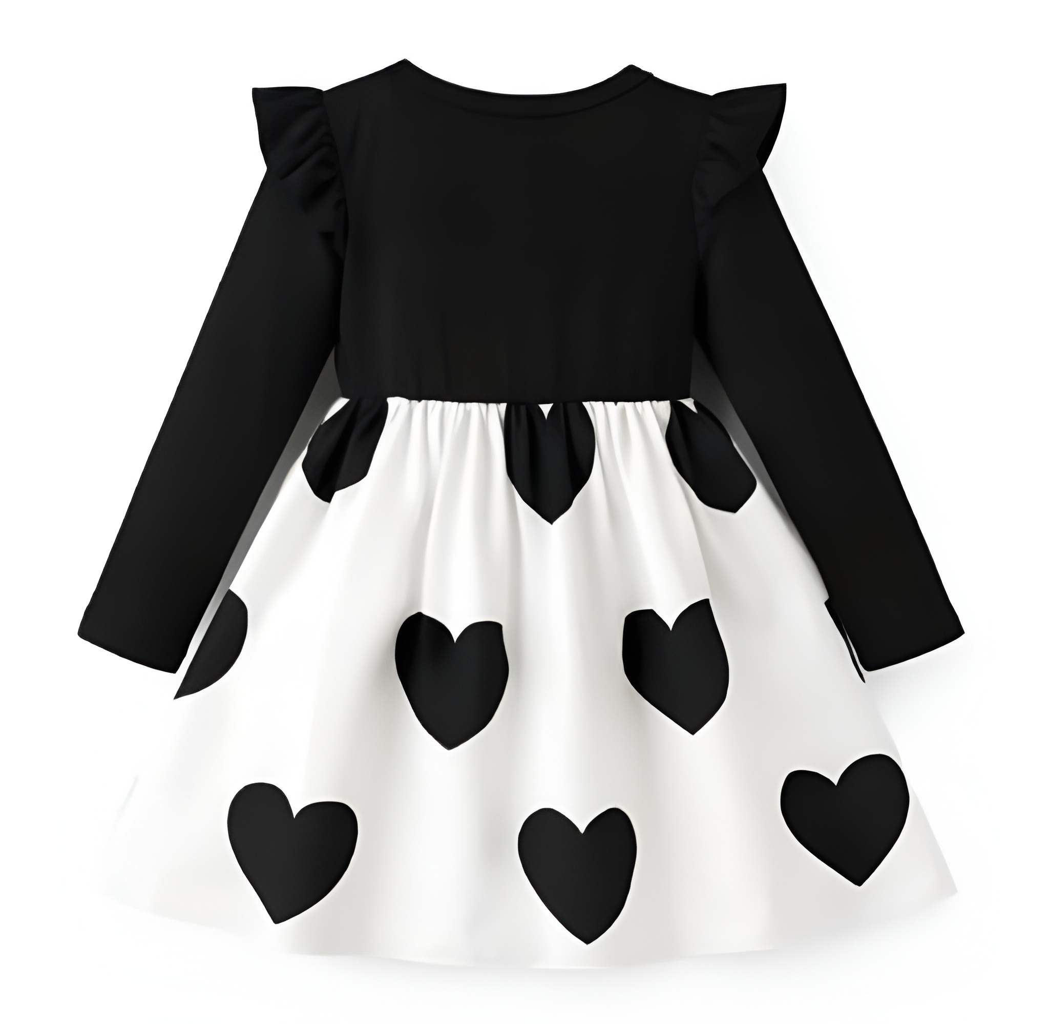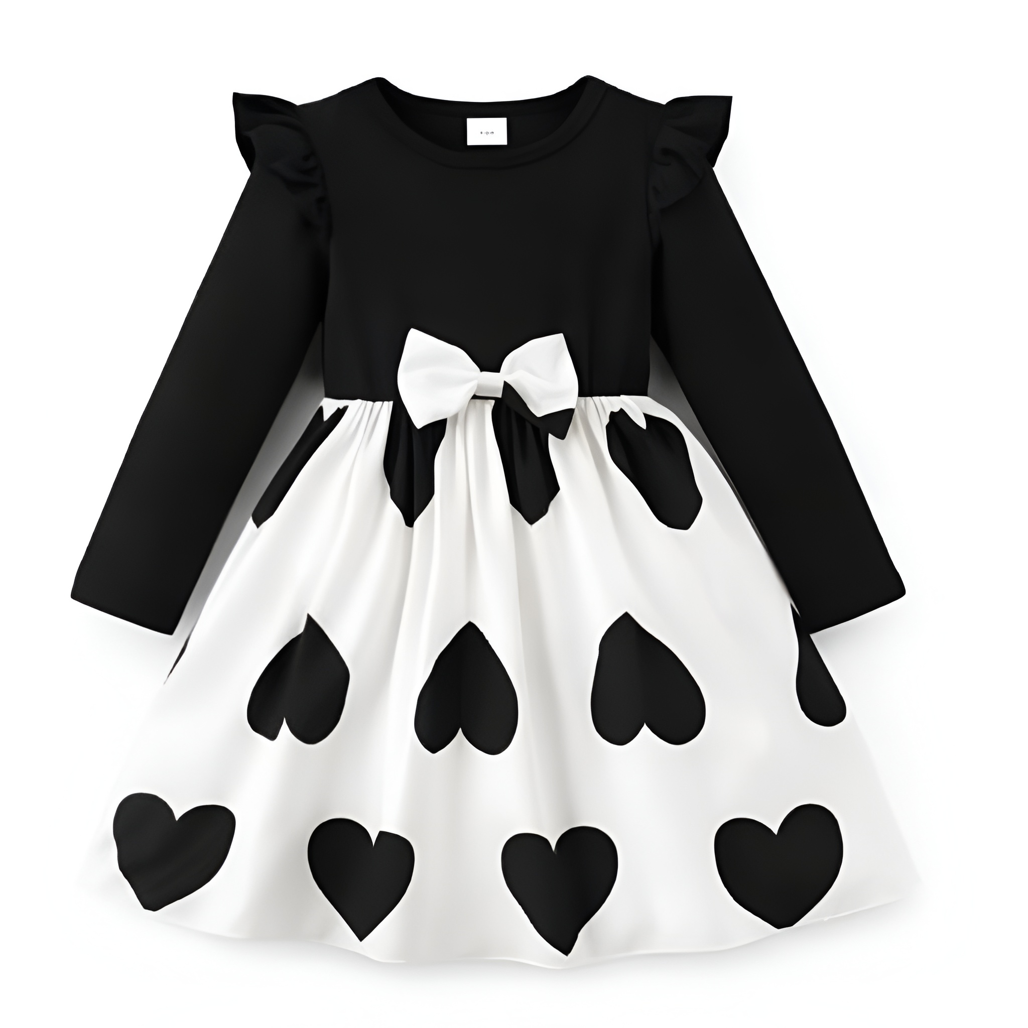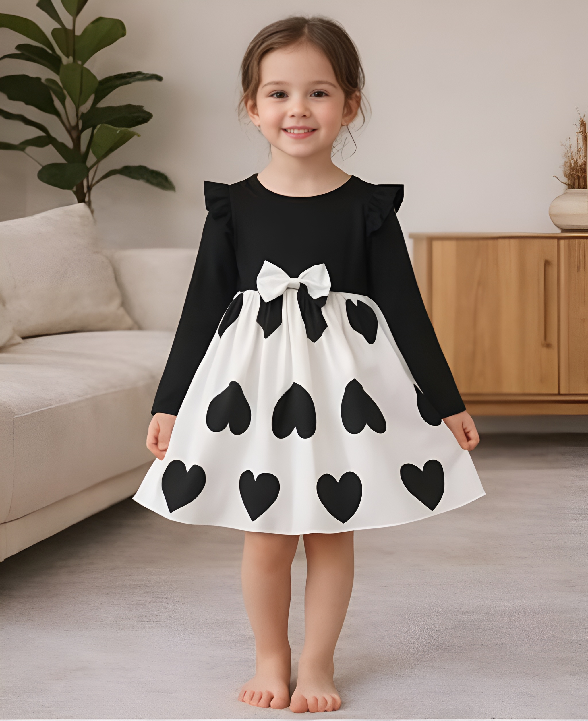 Elegancka i jednocześnie urocza sukienka dziewczęca w kontrastowym połączeniu czerni i bieli. Model wyróżnia się klasycznym krojem z długim rękawem oraz efektownym dołem ozdobionym dużymi sercami. Centralnym elementem jest dekoracyjna kokarda w pasie, która nadaje stylizacji wyjątkowego charakteru.