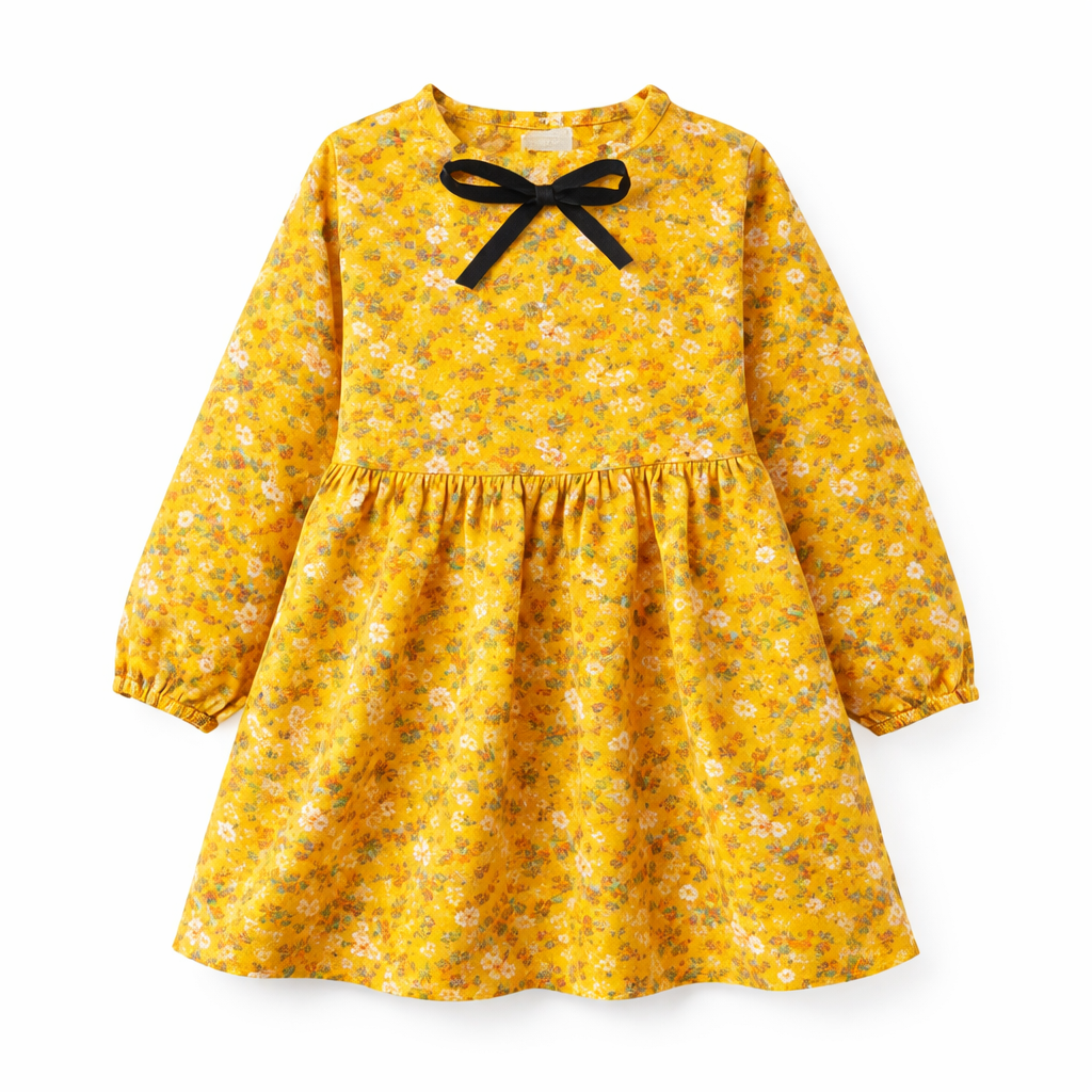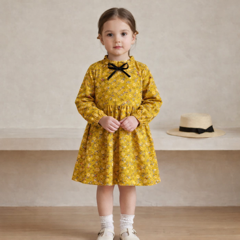 Stylowa sukienka dziewczęca w kwiatowy wzór to idealna propozycja dla małych miłośniczek wygodnej i modnej odzieży. Musztardowy kolor w połączeniu z delikatnym florystycznym printem nadaje sukience wyjątkowego uroku, a ozdobna czarna kokardka przy dekolcie podkreśla elegancki charakter modelu.