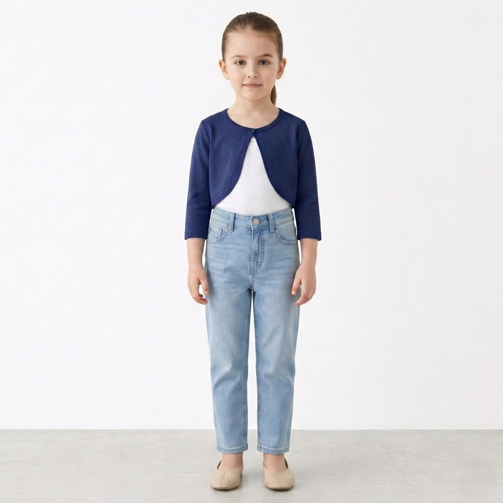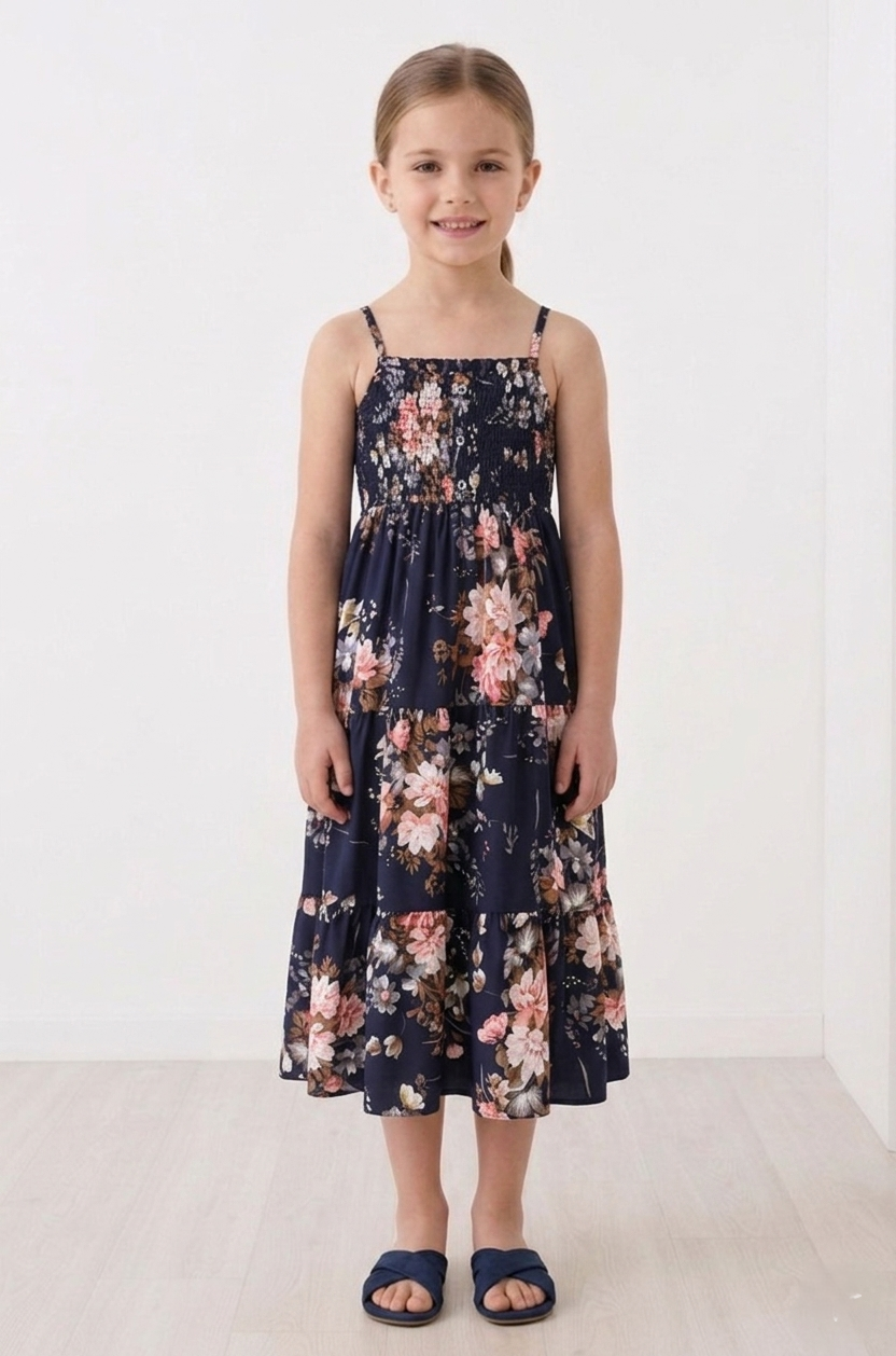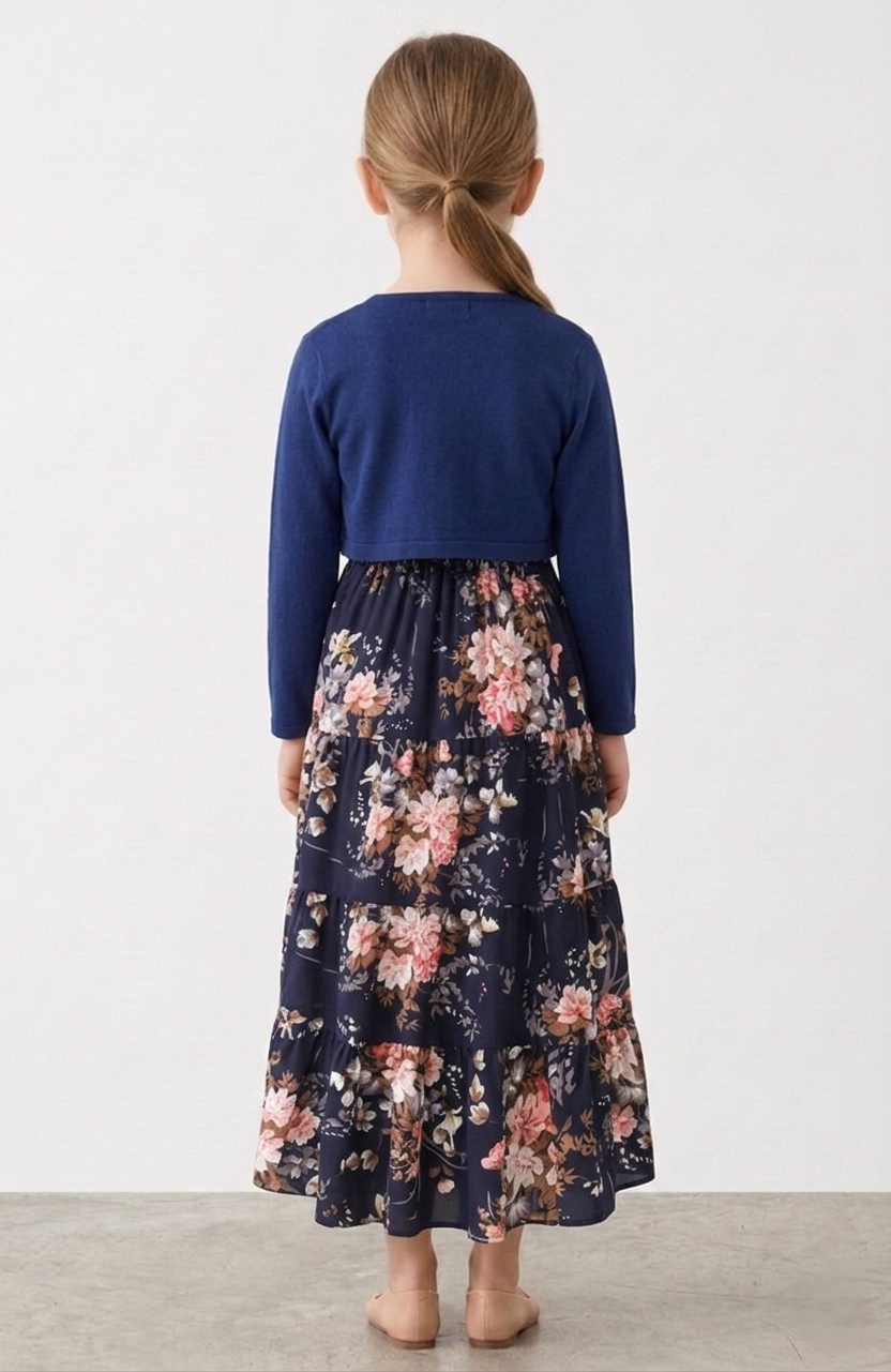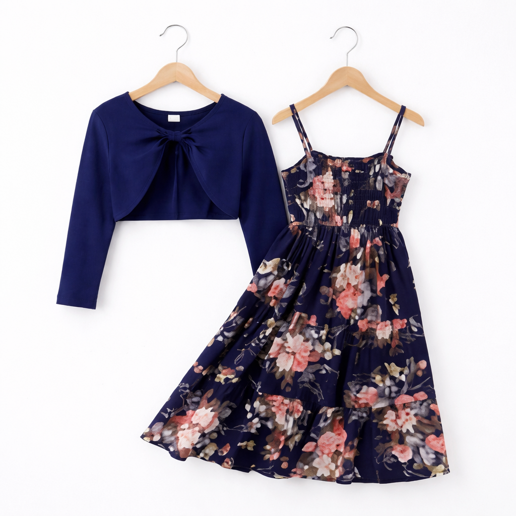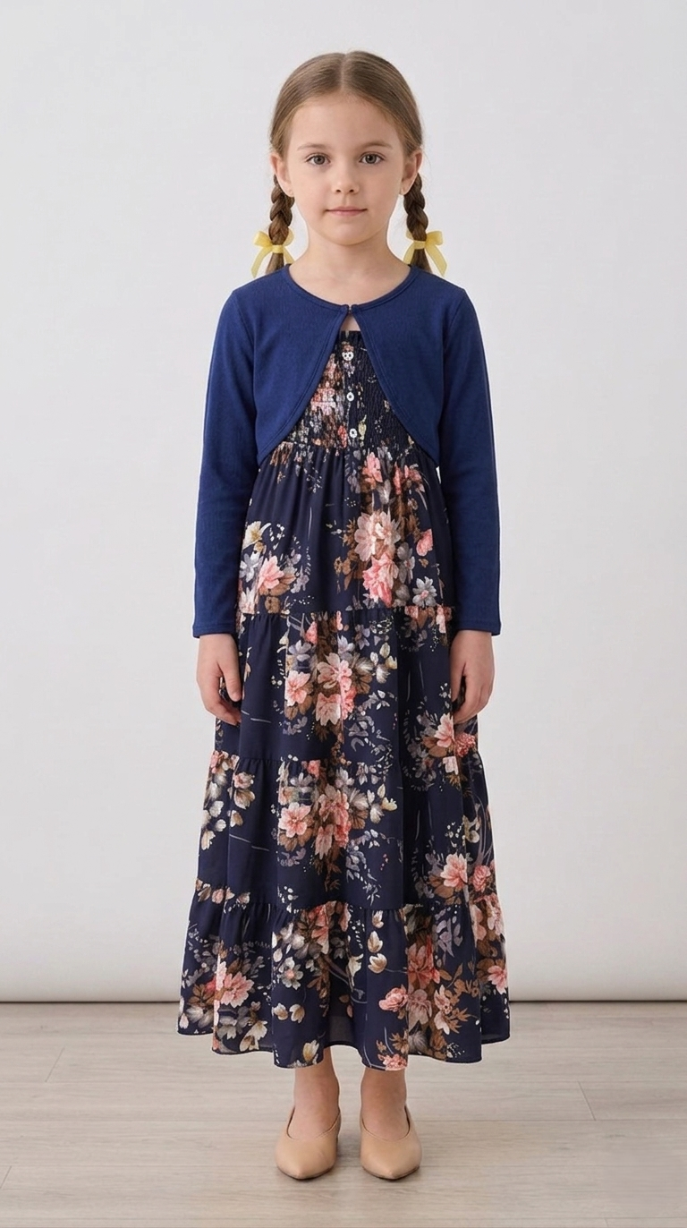 Stylowy komplet dziewczęcy składający się z efektownej sukienki na ramiączkach oraz dopasowanego bolerka z długim rękawem. Granatowa baza z subtelnym kwiatowym wzorem nadaje całości elegancki i ponadczasowy charakter. To idealny wybór dla rodziców, którzy szukają wygodnej i estetycznej stylizacji dla dziecka na uroczystości rodzinne, przyjęcia i codzienne eleganckie wyjścia.
