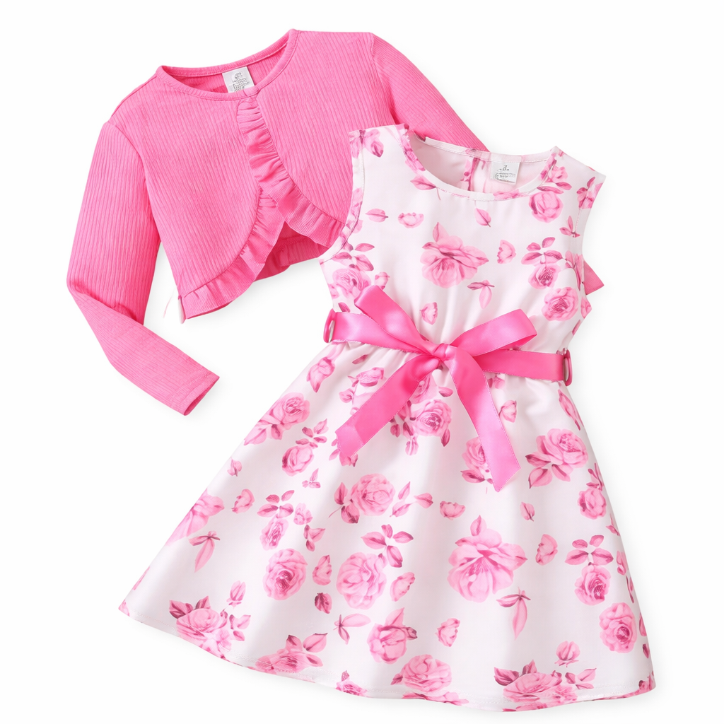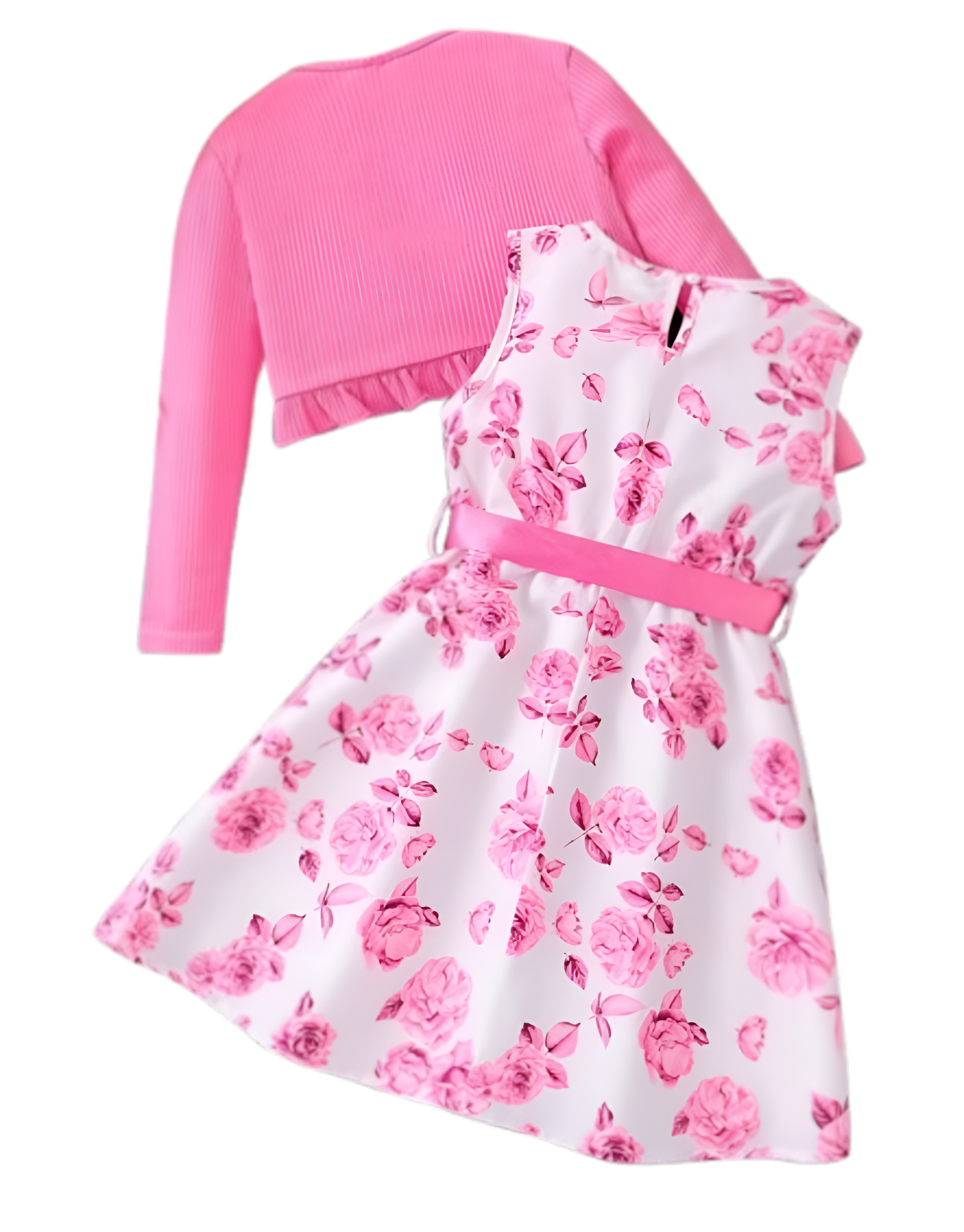 Sukienka dziewczęca w kwiaty ze wstążką różowy sweterek – elegancki komplet dziecięcy