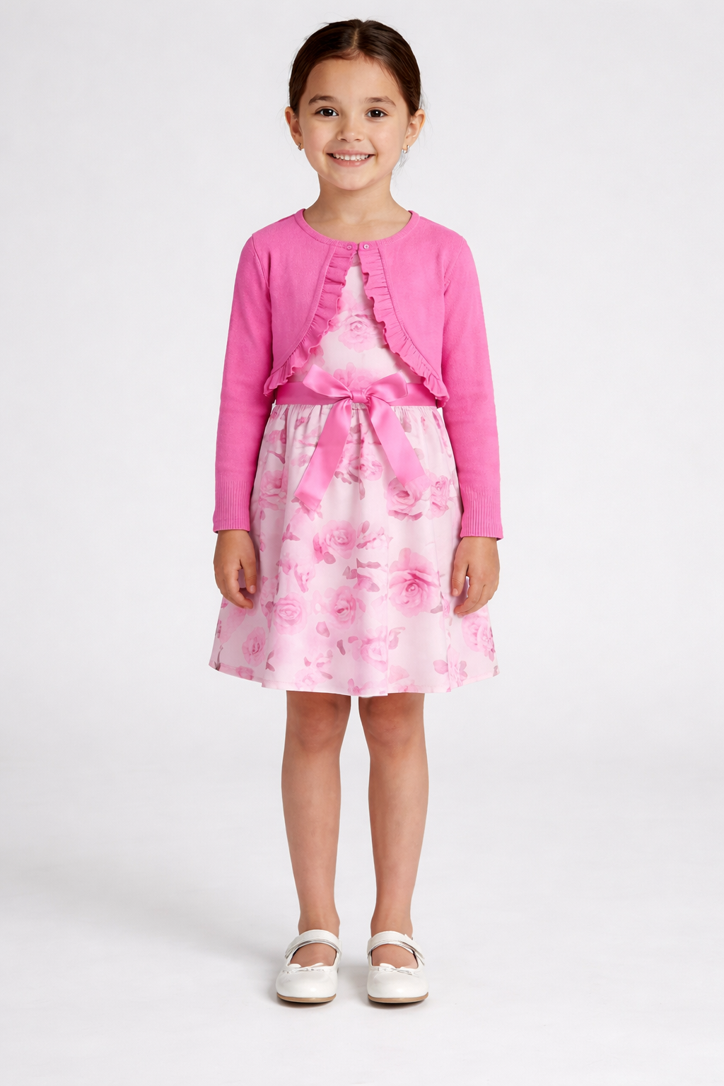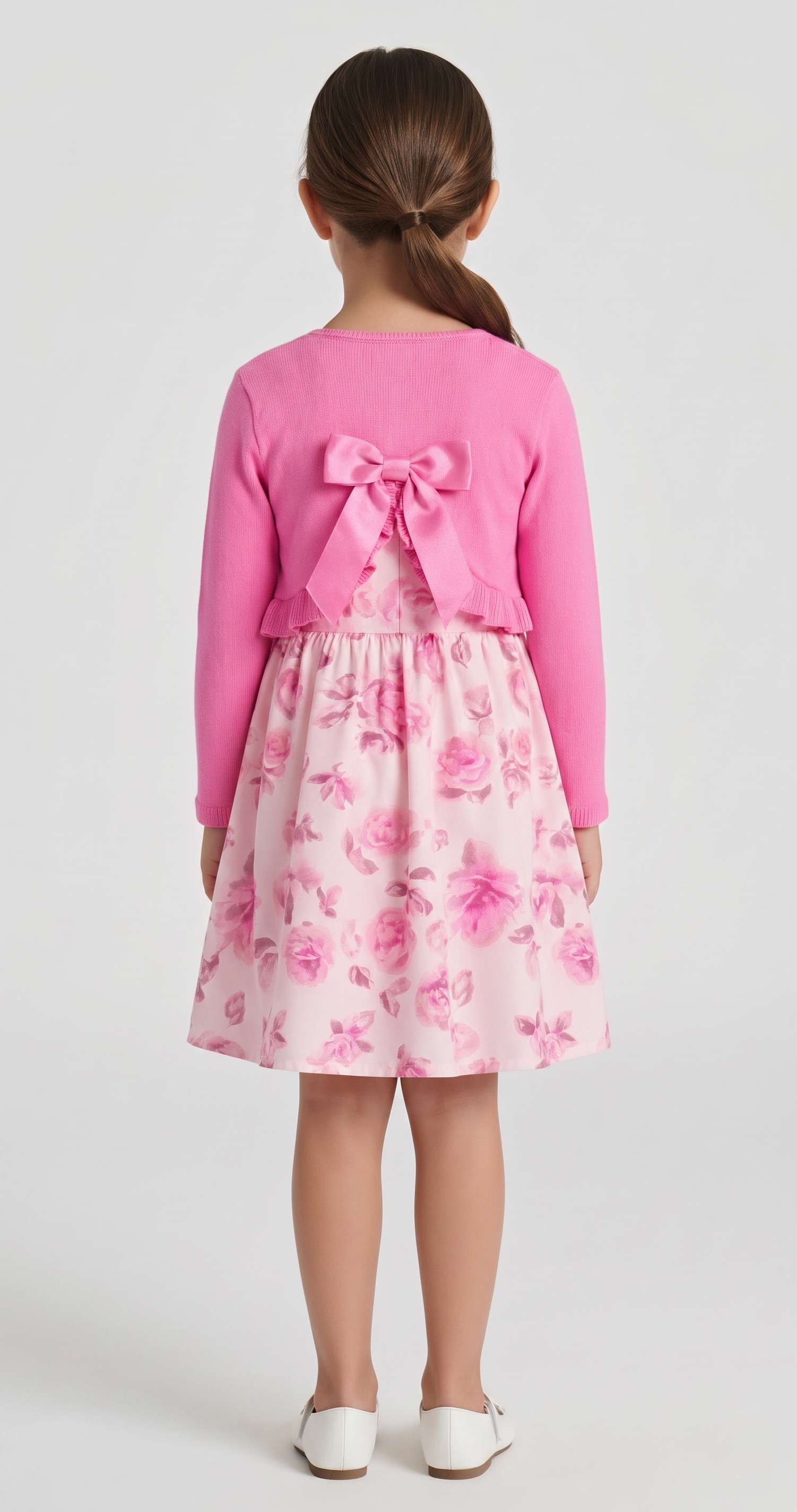 Stylowy komplet dziewczęcy składający się z sukienki w kwiatowy wzór oraz dopasowanego różowego bolerka. Całość tworzy elegancką, a jednocześnie dziewczęcą stylizację idealną na wyjątkowe okazje. Sukienka z ozdobną kokardą w pasie podkreśla urok i nadaje klasyczny wygląd.