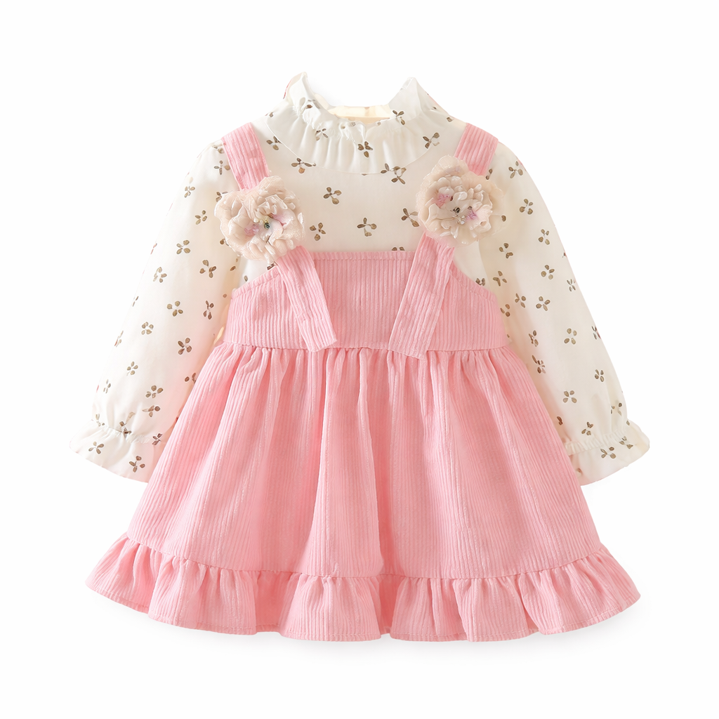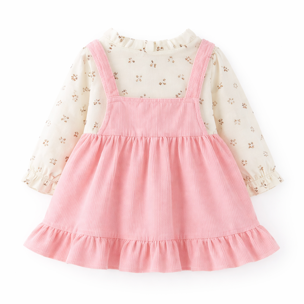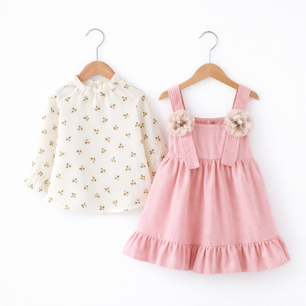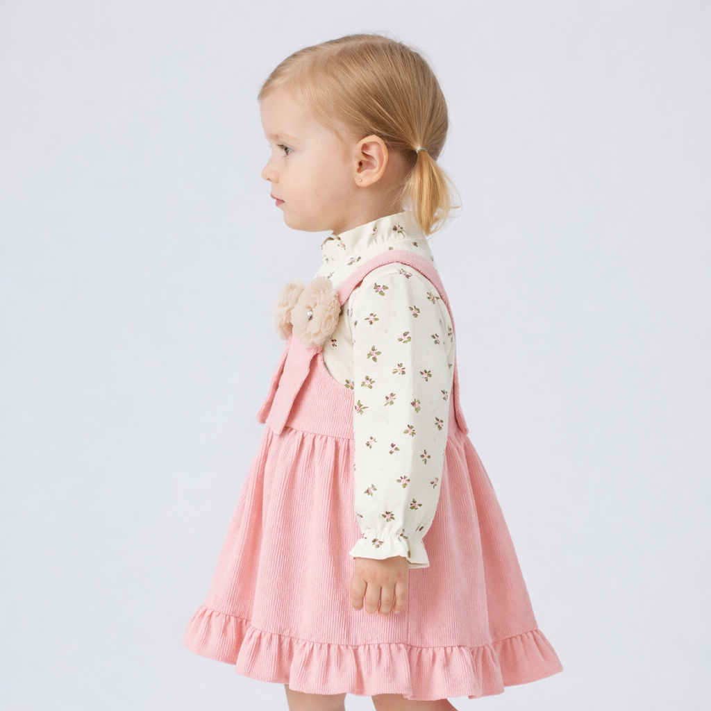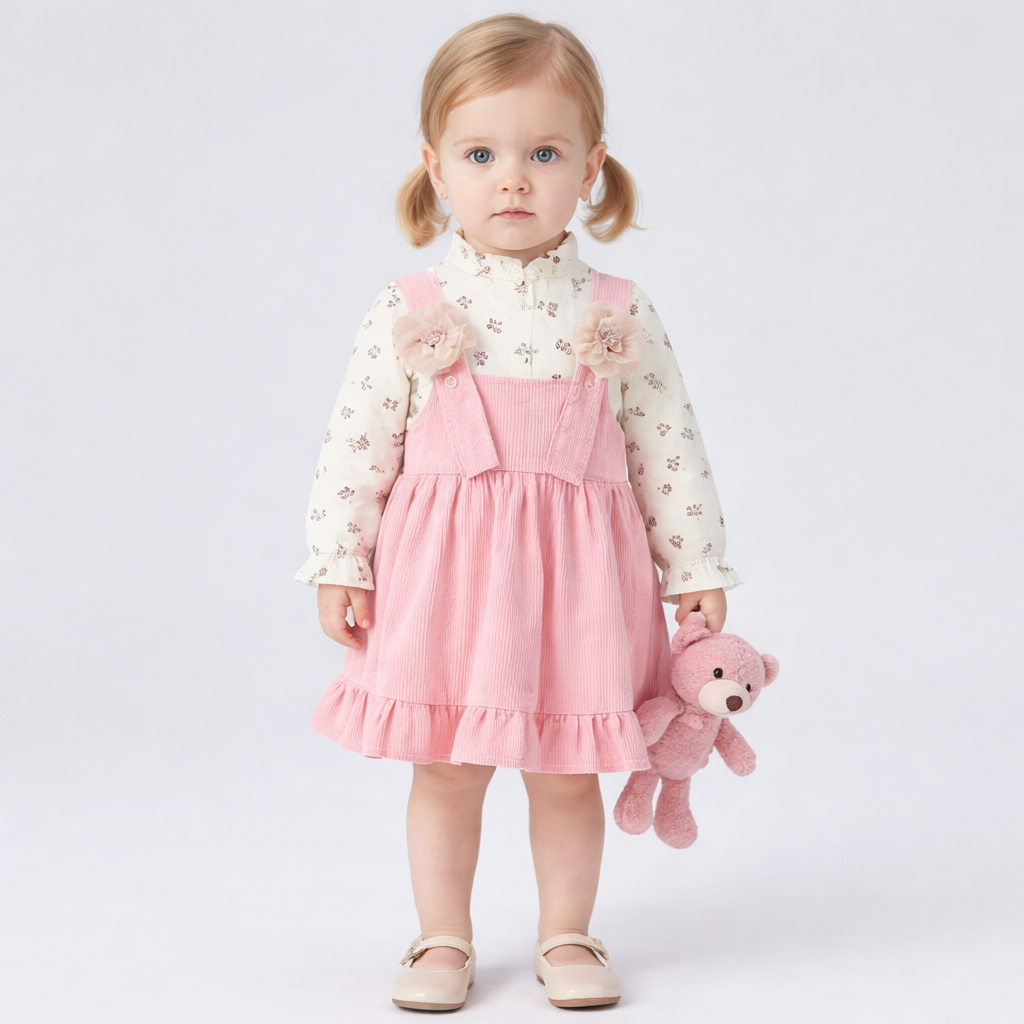 Uroczy komplet dla dziewczynki, który łączy subtelną elegancję z dziecięcą delikatnością. Różowa sukienka na szelkach zestawiona z ozdobną bluzką tworzy wyjątkową stylizację idealną na ważne okazje.