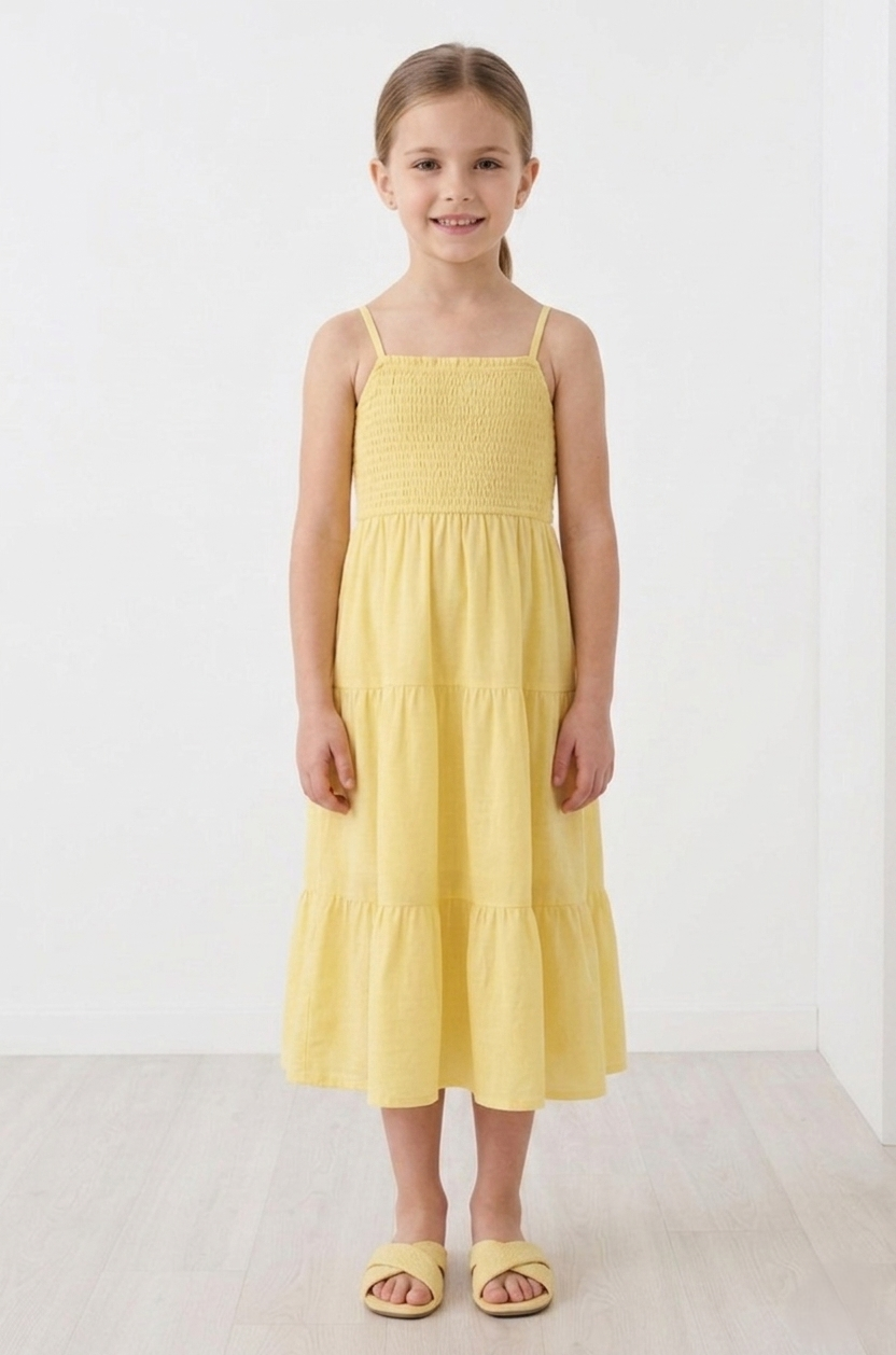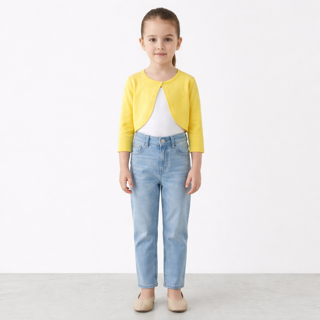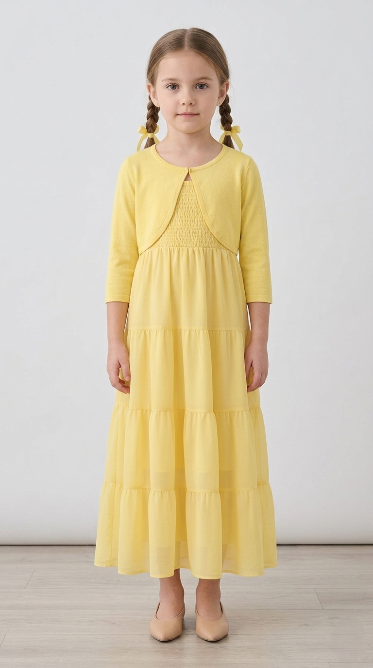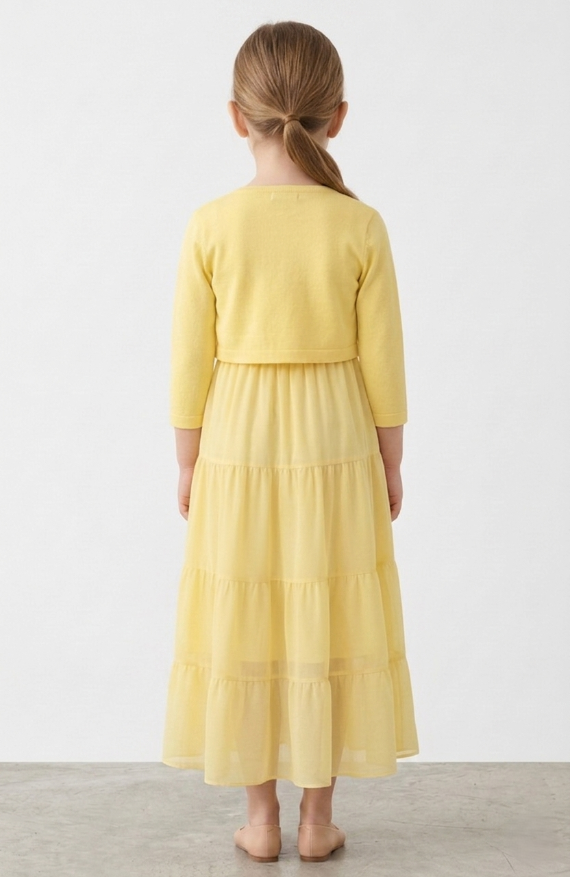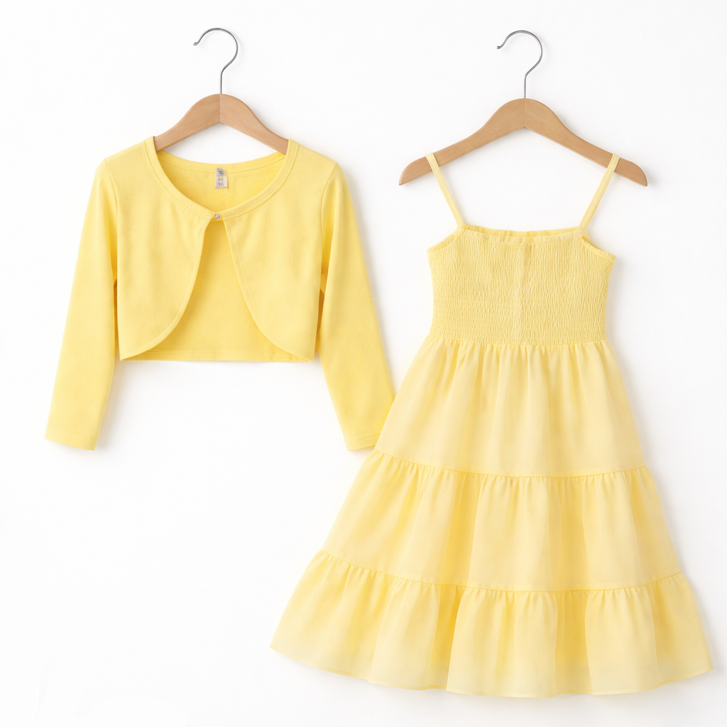 Stylowy komplet dziewczęcy składający się z lekkiej, rozkloszowanej sukienki na ramiączkach oraz dopasowanego bolerka z długim rękawem. Jasnożółty kolor nadaje całości świeżości i subtelnej elegancji, dzięki czemu zestaw doskonale sprawdzi się zarówno na uroczystości rodzinne, jak i codzienne stylizacje w cieplejsze dni.