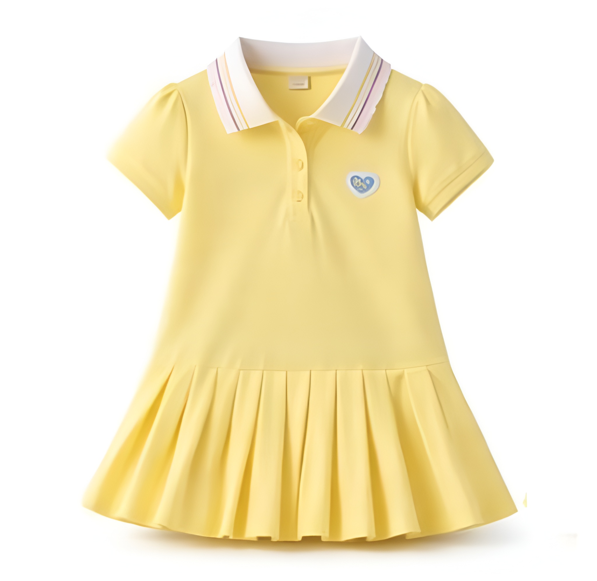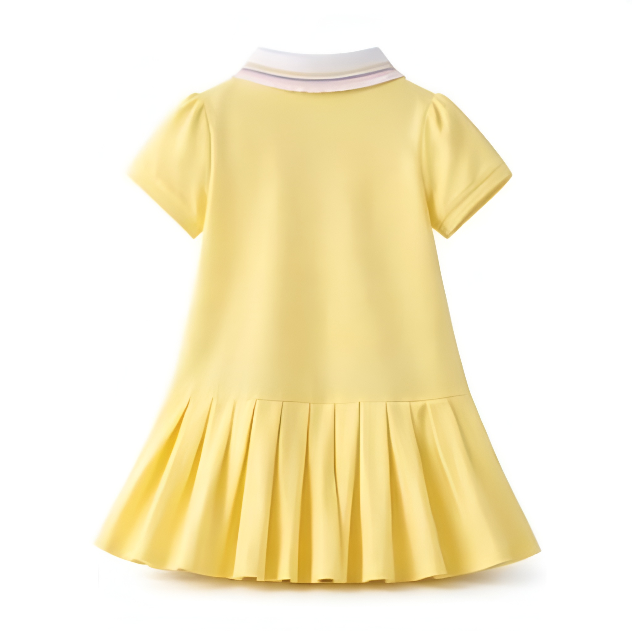 Stylowa i wygodna sukienka dziewczęca w pastelowym żółtym kolorze to idealny wybór dla małych miłośniczek modnych i komfortowych ubrań. Model wyróżnia się klasycznym krojem z krótkim rękawem, eleganckim kołnierzykiem polo oraz plisowanym dołem, który nadaje całości lekkości i dziewczęcego uroku. Delikatny haftowany detal na piersi podkreśla staranne wykończenie produktu.